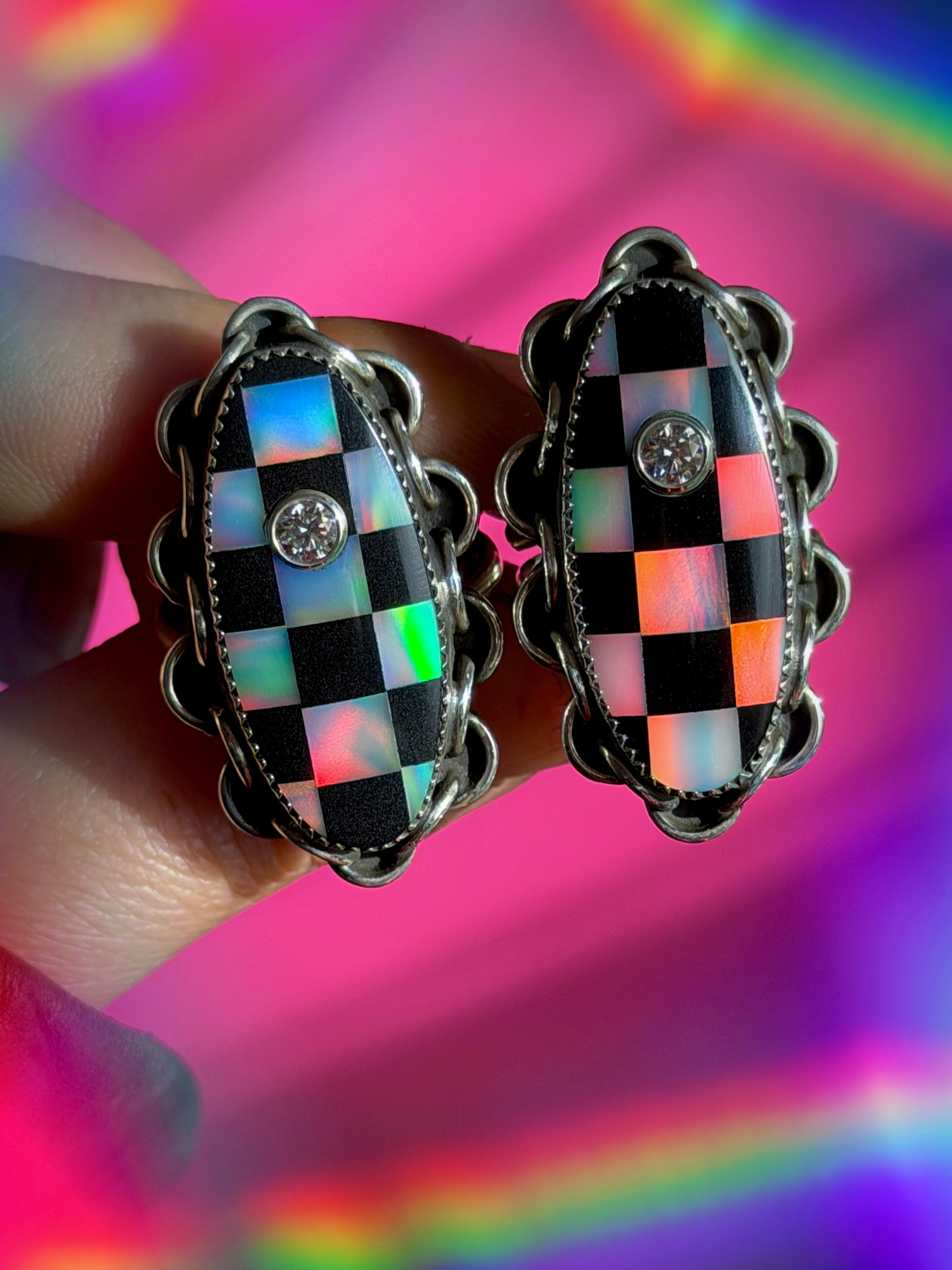 Wild Ride Silver Original Mixed Media Cabochon handmade from synthetic materials ( imitation opal and acrylic composite) with bezel set Moissanite, set in 925 Sterling Silver and 999 Fine Silver, on a split shank band.