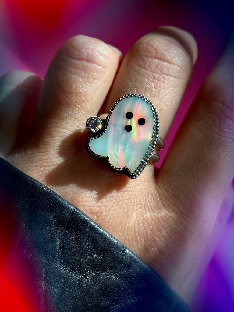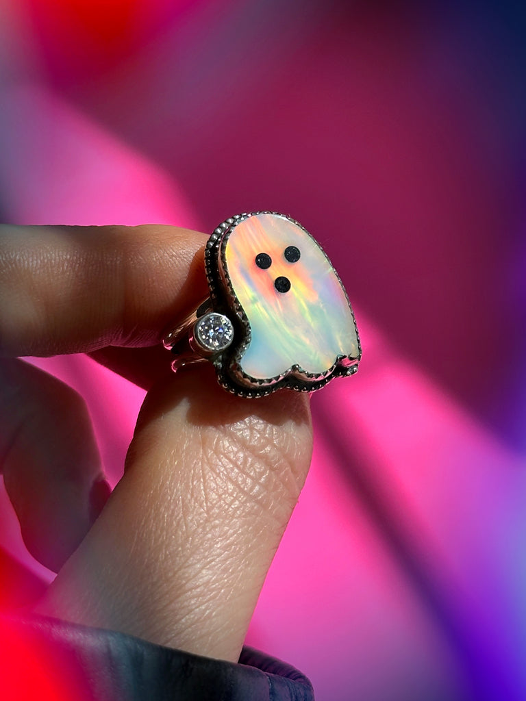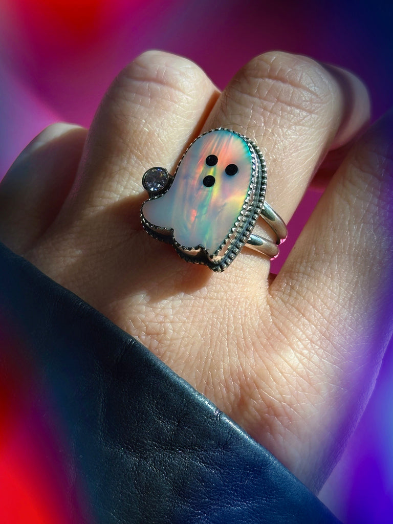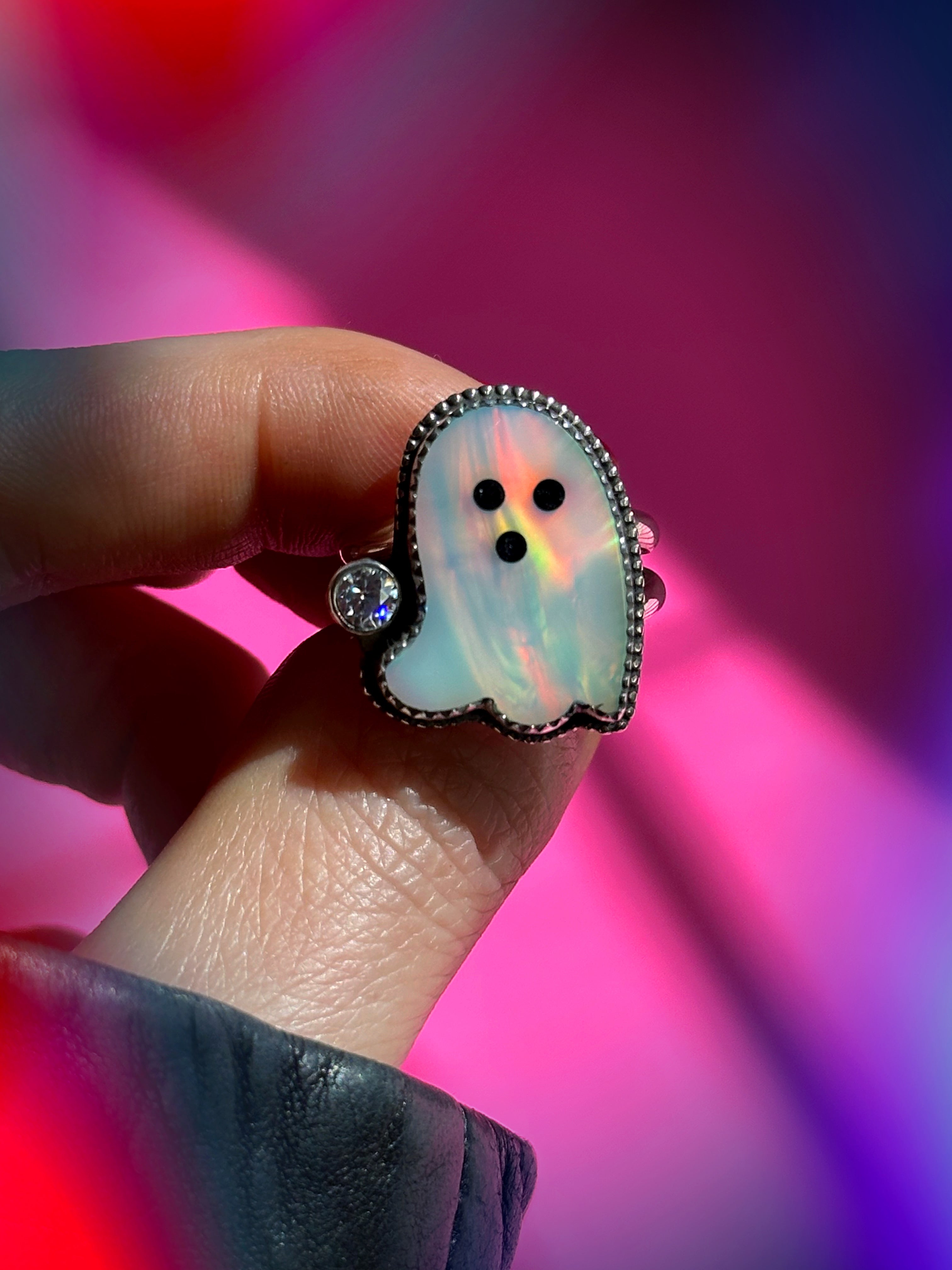 Handcrafted imitation Opal Ghost charm with Moissanite, set in 999 Fine Silver & 925 Sterling Silver on a split shank band.