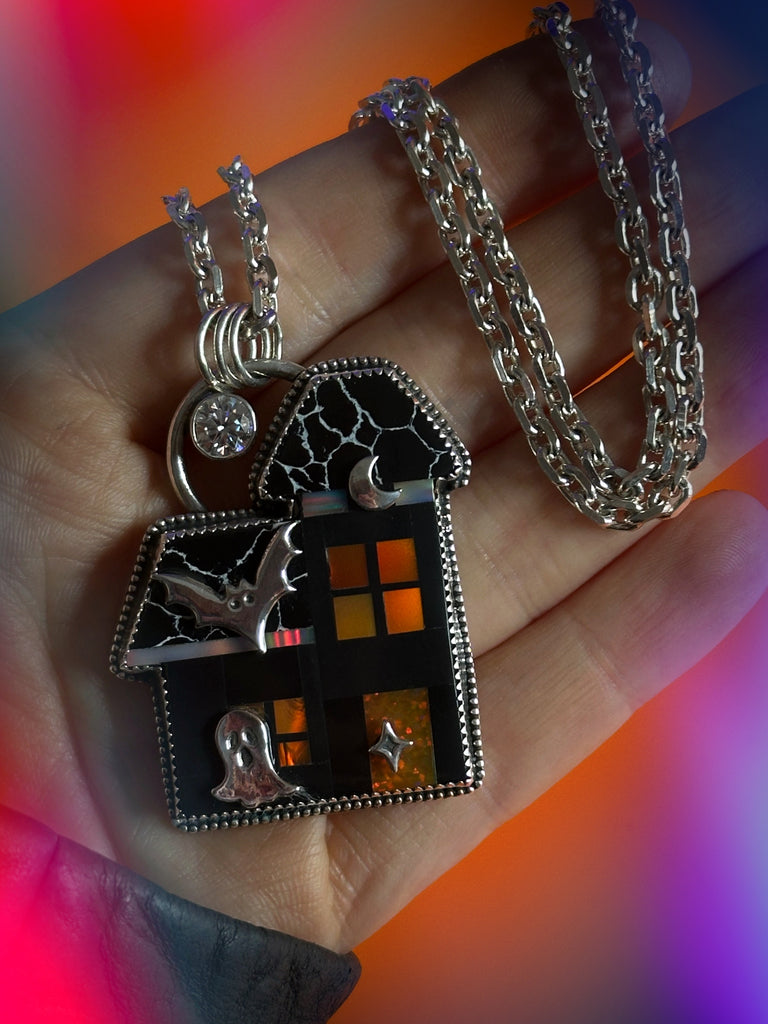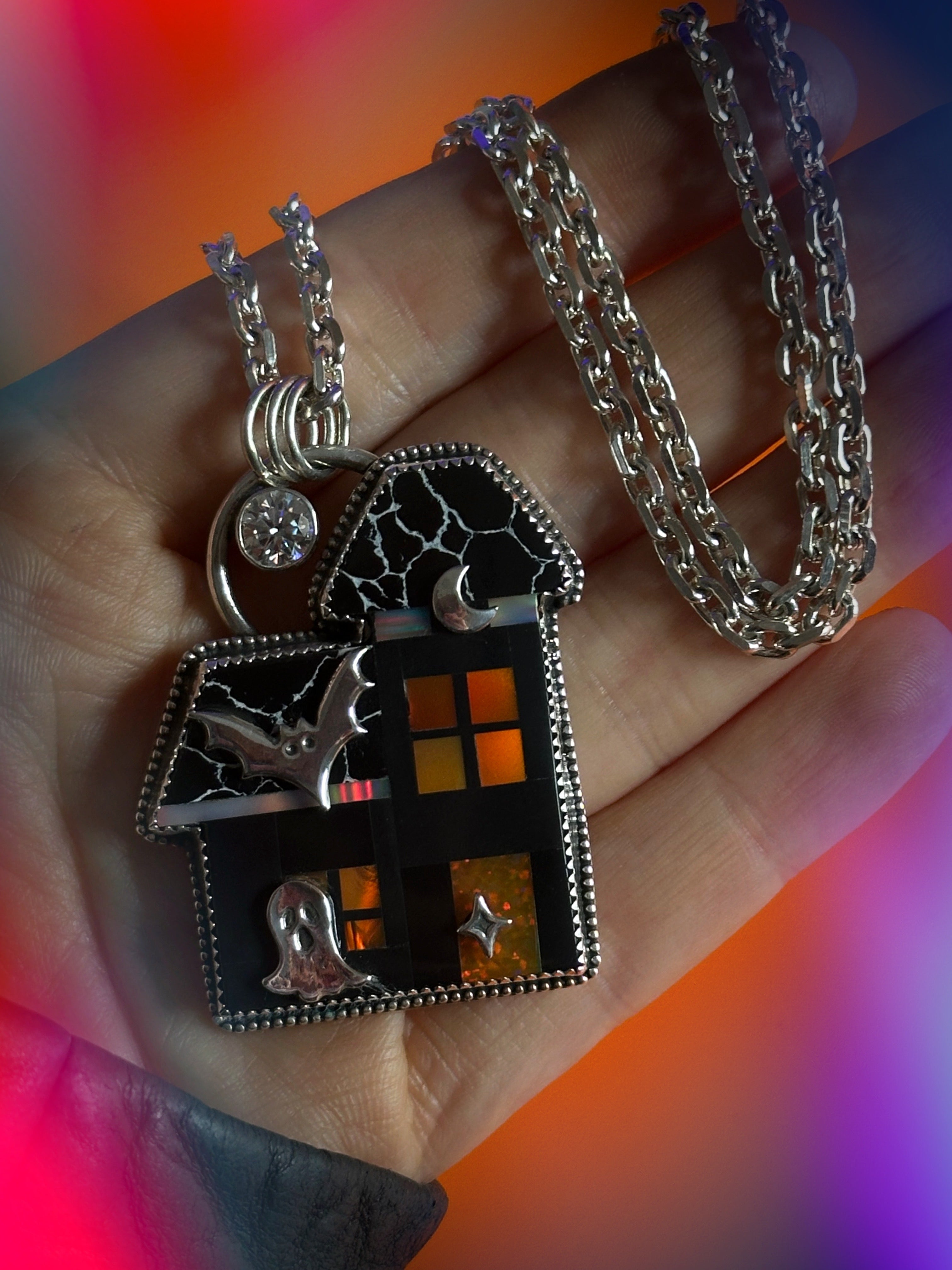 Handcrafted Wild Ride Silver Original Haunted House Cabochon made from imitation Opal and acrylic composites, featuring 5 Sterling Silver accent findings, and a 0.84 carat Moissanite, set in 999 Fine Silver & 925 Sterling Silver on a Sterling Silver chain.