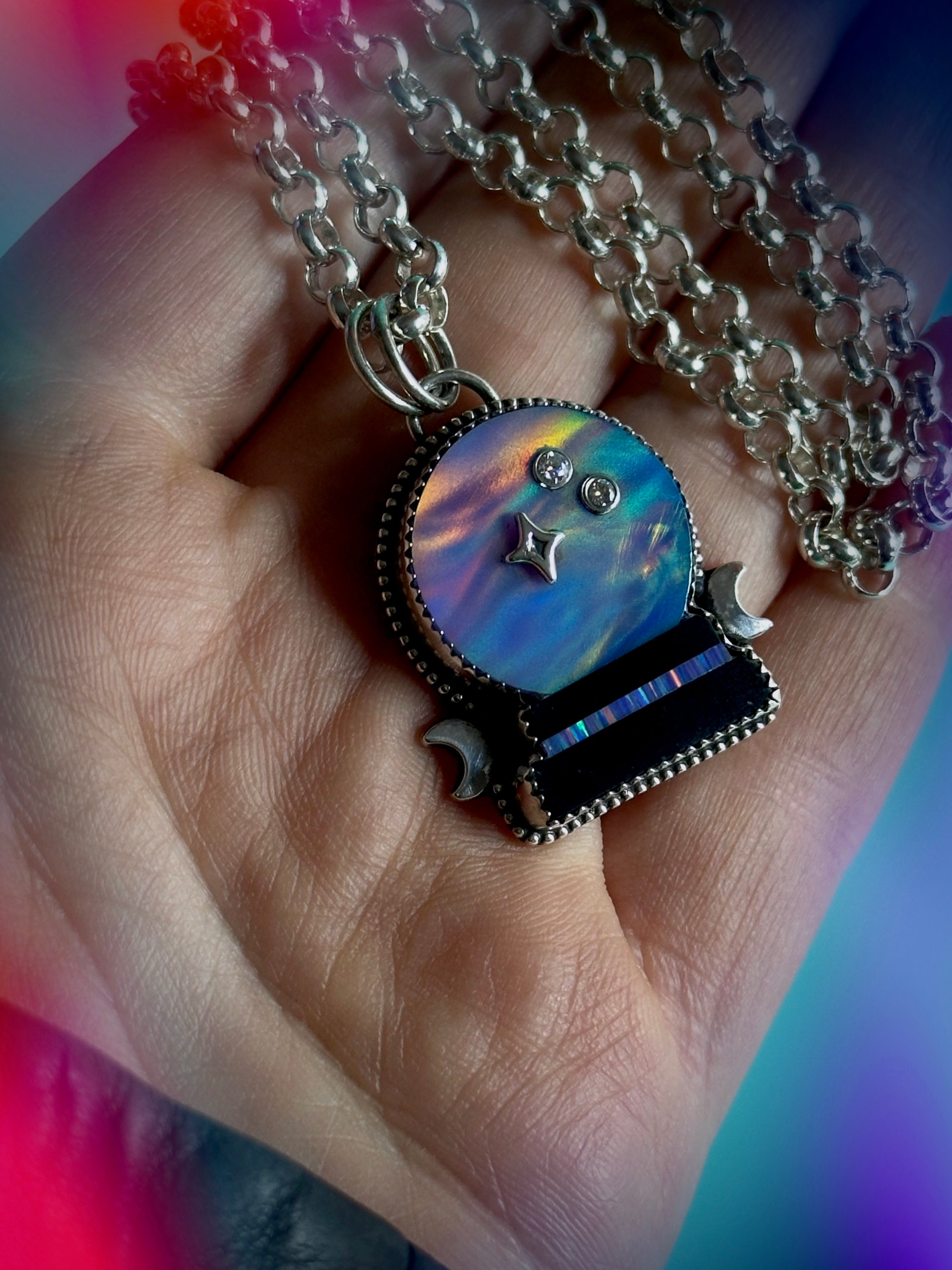 Wild Ride Silver Original Mixed Media Cabochon handmade from synthetic materials ( imitation opal, acrylic composite and synthetic opal) with bezel set Moissanite and sterling silver findings, set in 925 Sterling Silver and 999 Fine Silver, on a Sterling Silver Chain.