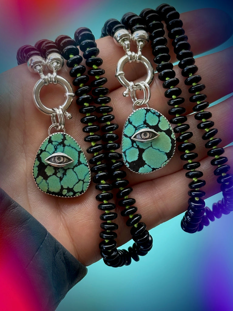 Stabilized Moon River Turquoise, cut and polished by us in house and set in handcrafted 999 Fine & 925 Sterling Silver with inlayed Sterling Silver findings. We paired this rad Turquoise charm with black Czech glass beads hand knotted on neon DYED 100% FINE SILK cord for a soft drape. The traditional silk knotting technique gives the necklace beautiful movement while protecting the beads from rubbing against one another. Approximately 16 inches in length.