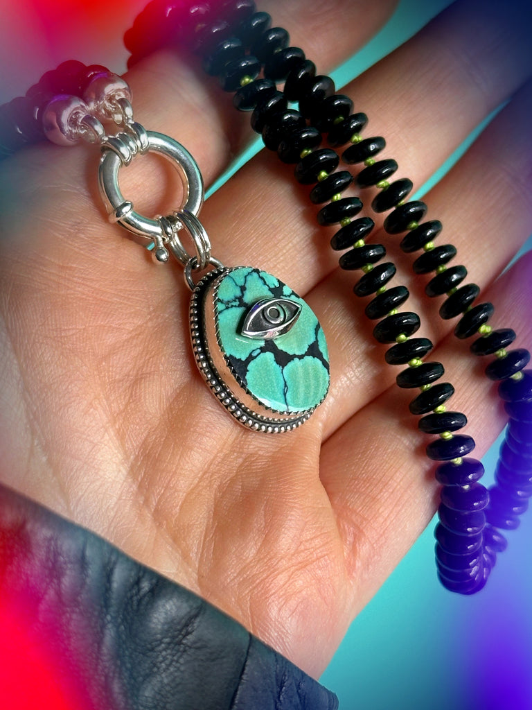 Stabilized Moon River Turquoise, cut and polished by us in house and set in handcrafted 999 Fine & 925 Sterling Silver with inlayed Sterling Silver findings. We paired this rad Turquoise charm with black Czech glass beads hand knotted on neon DYED 100% FINE SILK cord for a soft drape. The traditional silk knotting technique gives the necklace beautiful movement while protecting the beads from rubbing against one another. Approximately 16 inches in length.