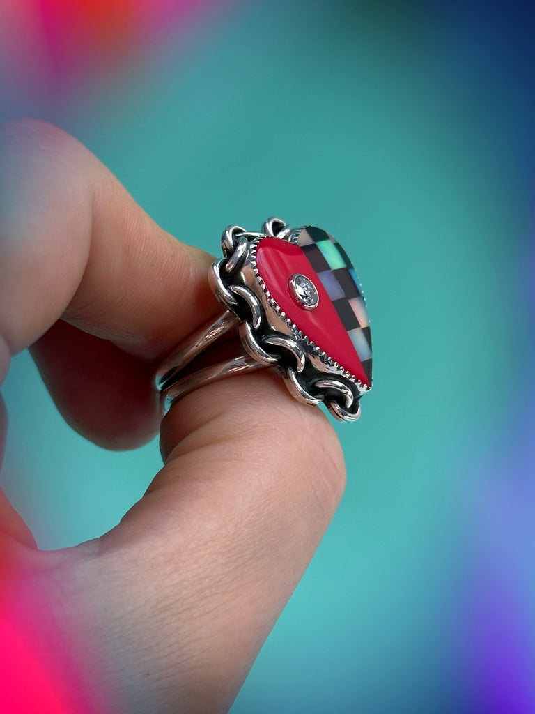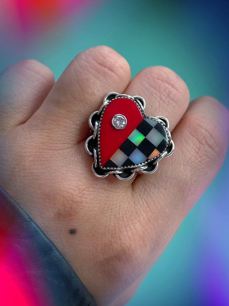 Two Way ❤️🏁 Blinged Out 💎Checkmate ⛓️ Love Link Ring - SIZE 9.5