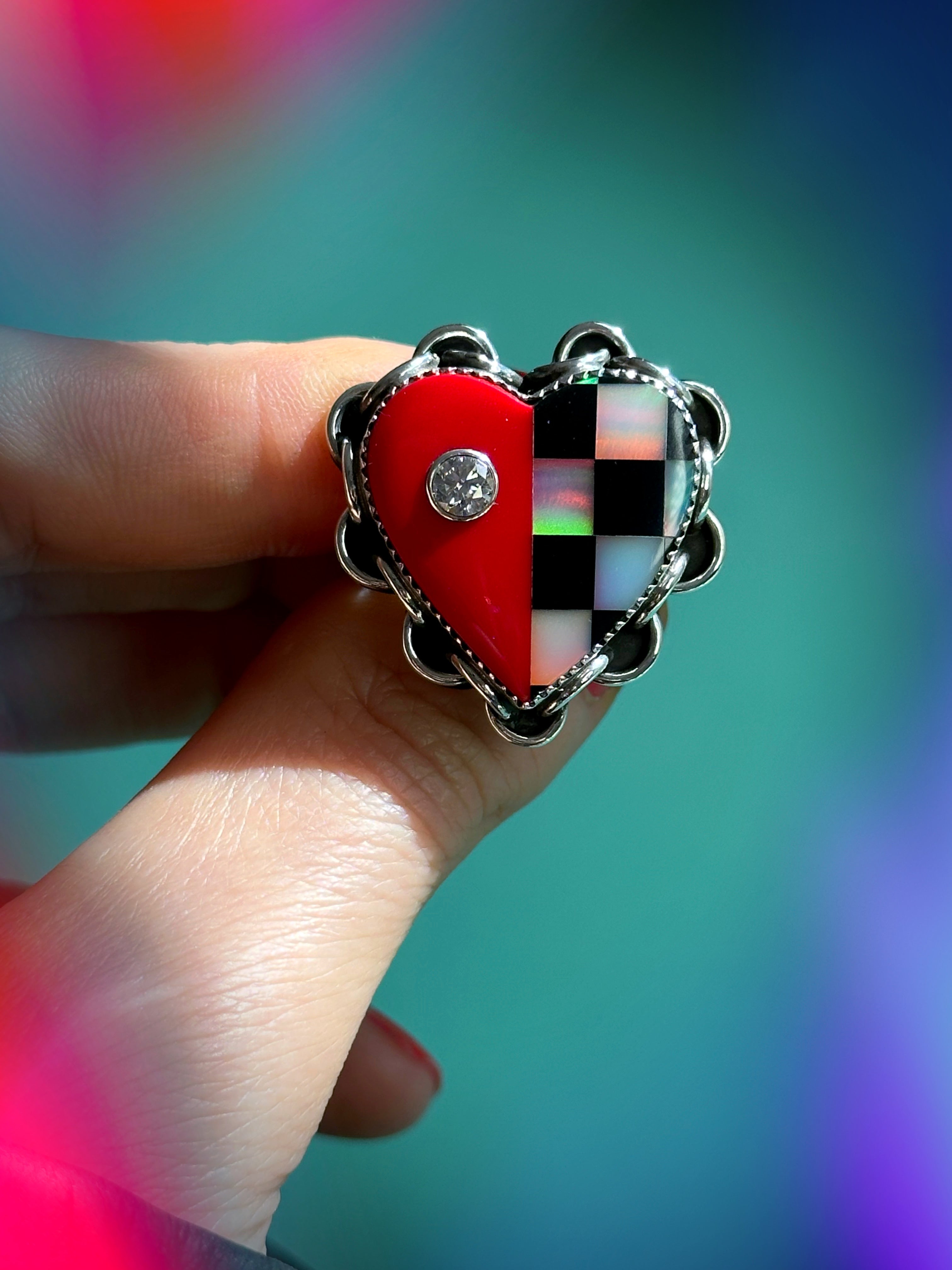 Wild Ride Silver Original Mixed Media Cabochon handmade from synthetic materials ( imitation opal, acrylic composite and upcycled billiard ball) with bezel set Moissanite, set in 925 Sterling Silver and 999 Fine Silver, on a split shank band.